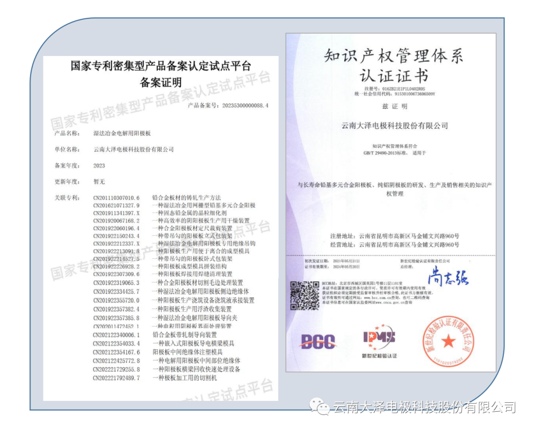 本次被認(rèn)定的產(chǎn)品名稱是“濕法冶金電解用陽(yáng)極板”,國(guó)家專利密集型產(chǎn)品備案號(hào)20235300000088.4。